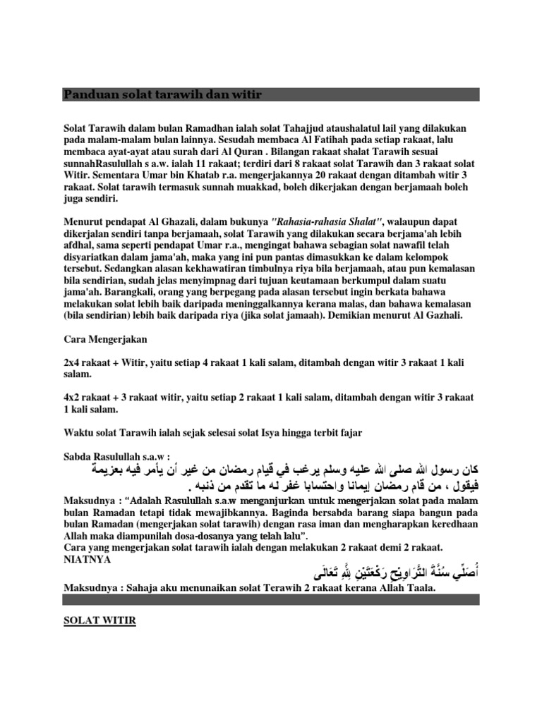 Jakim Panduan Solat Tarawih Bersendirian Sepanjang Pkp from ecentral.my Tata cara shalat tarawih 8, 11 dan 23 rakaat berjamaah dan bacaannya, pengertian, tuliskan dalil tentang boleh. Namun sholat witir ini juga bisa dilaksanakan pada 2/3 malam nantinya. Apa saja keutamaan shalat tarawih, bagaimana tata cara, niat dan bacaannya? Kalau imam sholat 8 rakaat + 3 rakaat witir, makmum mengikuti itu. Masih berkaitan dengan artikel saya sebelumnya yaitu keutamaaan bulan ramadhan. Misalkan, ketika seorang muslim lupa melaksanakan salat karena tidak sengaja dan terpaksa, ia harus segera mengambil wudu. Dengan ringkas berikut tata cara mengerjakannya : Sebaiknya mengikuti tata cara sholat tarawih sesuai yang dilakukan imam.