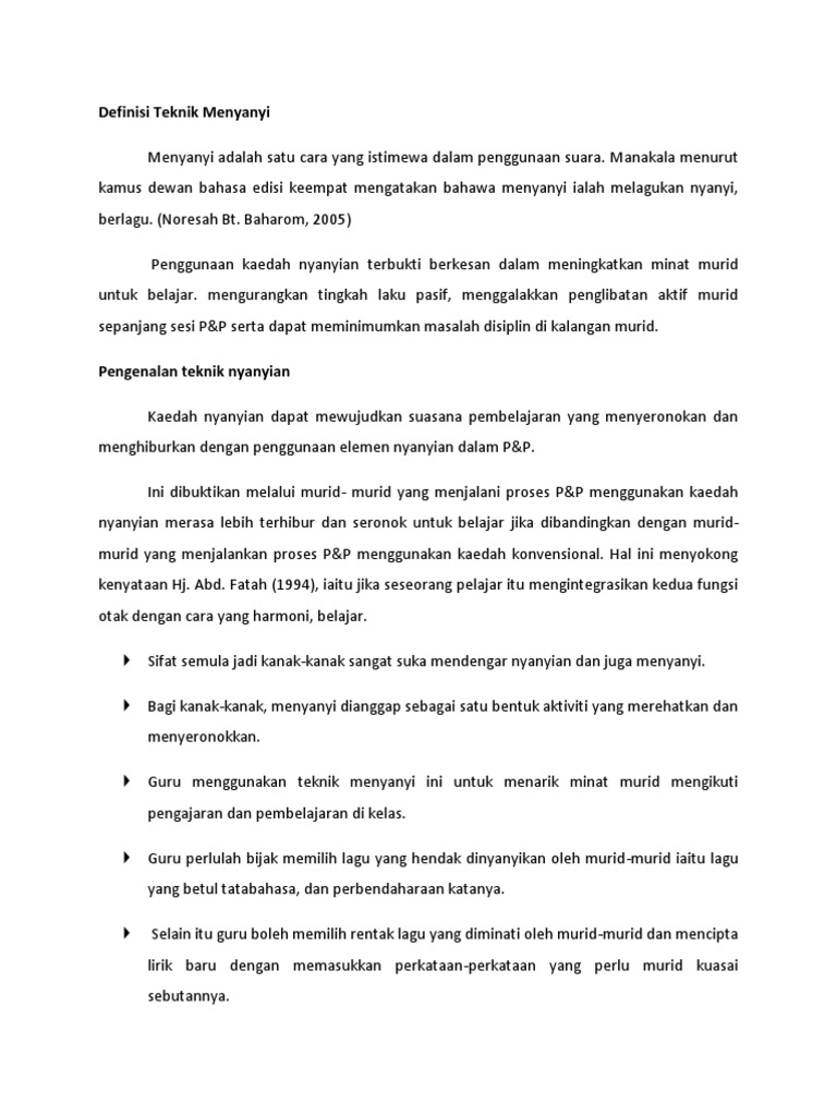Pengenalan teknik nyanyian kaedah nyanyian dapat mewujudkan suasana pembelajaran yang menyeronokan dan menghiburkan dengan penggunaan elemen nyanyian dalam p&p. Pembahasan ini disampaikan oleh ustadz ahmad zainuddin, lc. Tajuk karaoke atau nyanyian dalam pengajaran dan pembelajaran. Sama ada mereka akan berminat. Nyanyian merupakan salah satu kaedah yang paling digemari oleh murid kerana iringan muzik memberi impak kepada nyanyian dan dapat membantu murid menguasai kosa kata.