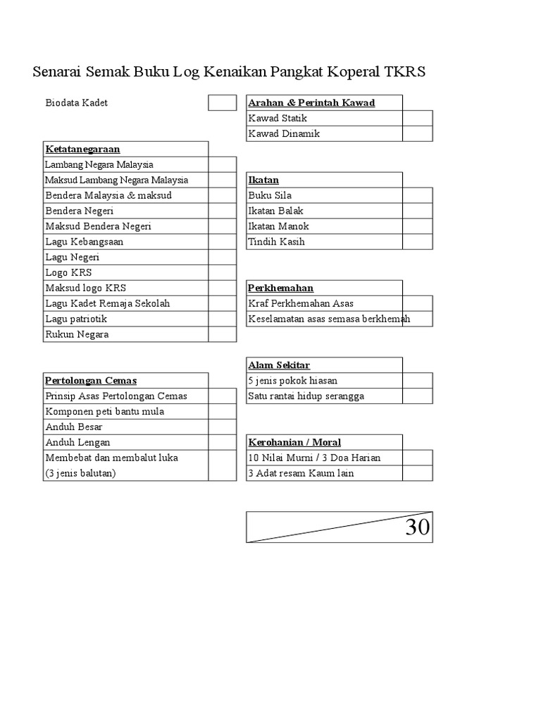Buku panduan kadet remaja sekolah dan tunas kadet remaja sekolah tatacara pemakaian, panggilan dan tanda pangkat, kadet remaja sekolah ( krs ) dan tunas kadet remaja sekolah ( tkrs) ( murid & pegawai ) disediakan oleh : Download 2019.buku modul krs tkrs perdana melaka pdf for free. 19881125 200701 1 002 pangkat/gol : Contoh buku log projek tahun akhir. Diniah 4, diniah 5, diniah 6. View buku log krs.docx from hns 3192 at sultan idris university of education. Mohd loqman bin tammim no. Bahan lain yang admin telah kongsikan: Bulan dan bintang agama islam sebagai agama rasmi negara. Buku terbuka dan rehal peranan institusi pendidikan yang mementingkan tradisi ilmu untuk semua tanpa mengira keturunan, kaum. ( tkrs ) tunas kadet remaja sekolah ( tkrs ) telah mula diasaskan pada 15 mac 1999. Perisai melambangkan benteng ketahanan diri daripada sebarang gejala yang tidak sihat. Langsa, 11 juni 1983 status :