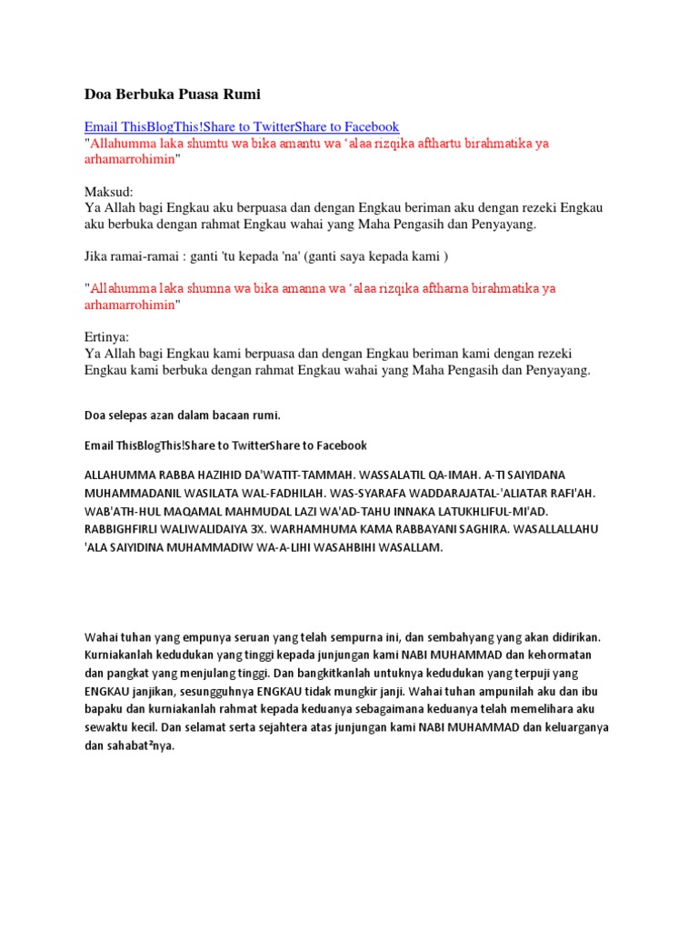 Berikut adalah bacaan doa berbuka puasa ramadhan beserta terjemahnya. Doanya adalah ringkas sebagaimana berikut mempercepatkan berbuka puasa apabila terbenamnya matahari. Sebelum berbuka puasa dianjurkan membaca doa sebagai rasa syukur. Pertama sekali anem nak mengucapkan selamat menjelang bulan ramadhan, sedia semua? Bantuan ejaan rumi turut disediakan bagi mereka yang sukar membaca jawi. Niat qadha puasa ramadhan beserta terjemahnya. Puasa adalah menahan diri dari makan dan minum dimulai dari sejak terbitnya matahari hingga terbenamnya matahari. Puasa ramadhan boleh dibatalkan apabila sudah masuk waktu sholat maghrib atau ketika matahari sudah tenggelam di barat. Insyaallah dapat kita mencium lagi haruman bulan mulia ini. Terdapat puasa wajib maupun puasa sunnah, contoh puasa wajib adalah puasa di bulan ramadhan, sedangkan contoh puasa sunnah adalah puasa senin kamis. Mengerjakan solat sunat tarawih pada malam. Doa buka puasa 1 disebutkan sebagai lemah, haditsnya dhoif, sedangkan doa puasa kedua 2 haditsnya shahih. Allahumma lakasumtu wabika aamantu wa'alaa rizqika afthortu birohmatika yaa.