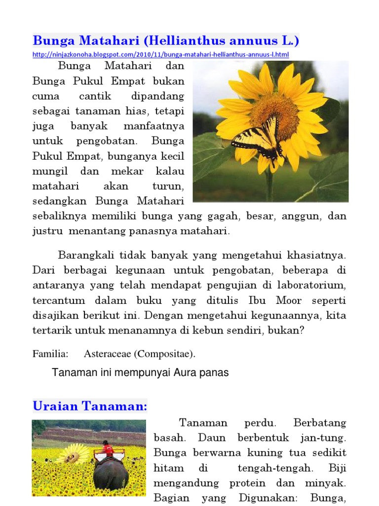 Dan masuk dalam famili compositae. Dan masuk dalam famili compositae. Dan masuk dalam famili compositae. Termasuk ke dalam famili tumbuhan compositae (asteraceae). Beberapa penyakit yang bisa diobati dengan bunga matahari antara lain hipertensi, sakit kepala, sakit gigi, nyeri menstruasi, reumatik, nyeri lambung, radang payudara, sulit melahirkan, disentri, campak.