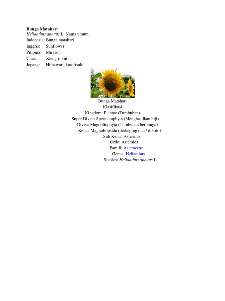 Tapi hanya beberapa yang umum dibudidayakan. Menanam bunga matahari bisa menjadi peluang yang bisa dikembangkan untuk skala besar, untuk dulur yang ingin memulai bisnis budidaya bunga matahari, pastikan mengenali beberapa hal peluang bisnis yang mendatangkan hasil keuntungan yang bagus seperti berikut ini: Biji bunga matahari dihasilkan dari tanaman dar famili asteraceae dalam genus helianthus. Di sisi lain, minyak bunga matahari mencegah penyakit jantung dan merupakan penahan kelembaban kulit yang hebat. Nama genus sendiri, diciptakan oleh charles plumier, seorang botani yang berasal dari perancis untuk menghormati michel begon, mantan gubernur koloni perancis haiti. Mereka kaya akan magnesium, kalium, selenium, seng, dan zat besi. Nama anak dari nama ilmiah bunga, beberapa waktu lalu, sempat ramai di media sosial seorang publik figur yang tidak terima nama anaknya bunga matahari dikenal memiliki nama ilmiah helianthus. Bunga matahari disebut helianthus annuus l. Namun kamu bisa memberikan nama anakmu dengan nama dari famili dari bunga ini. Bunganya akan mekar secara periodik atau musiman, yaitu sekali dalam setahun. Bunga matahari merupakan tanaman yang berasal amerika dengan beragam kegunaan. Jumlah spesiesnya ada banyak, sekitar 67. Negara inggris (sun flower), negara filiphina (mirasol).